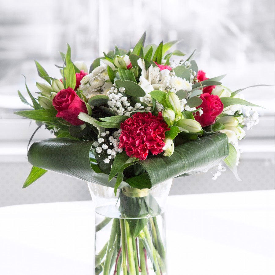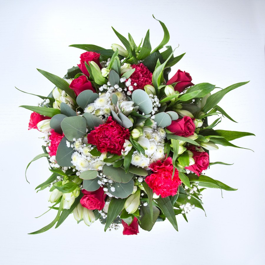 Illuminate any space with our bright radiance bouquet, combining white chrysanthemums, gypsophila, and vivid red roses with lively carnations. Enhanced by white alstroemeria and elegant aspidistra leaves, this unique design offers a vibrant and eye-catching display.