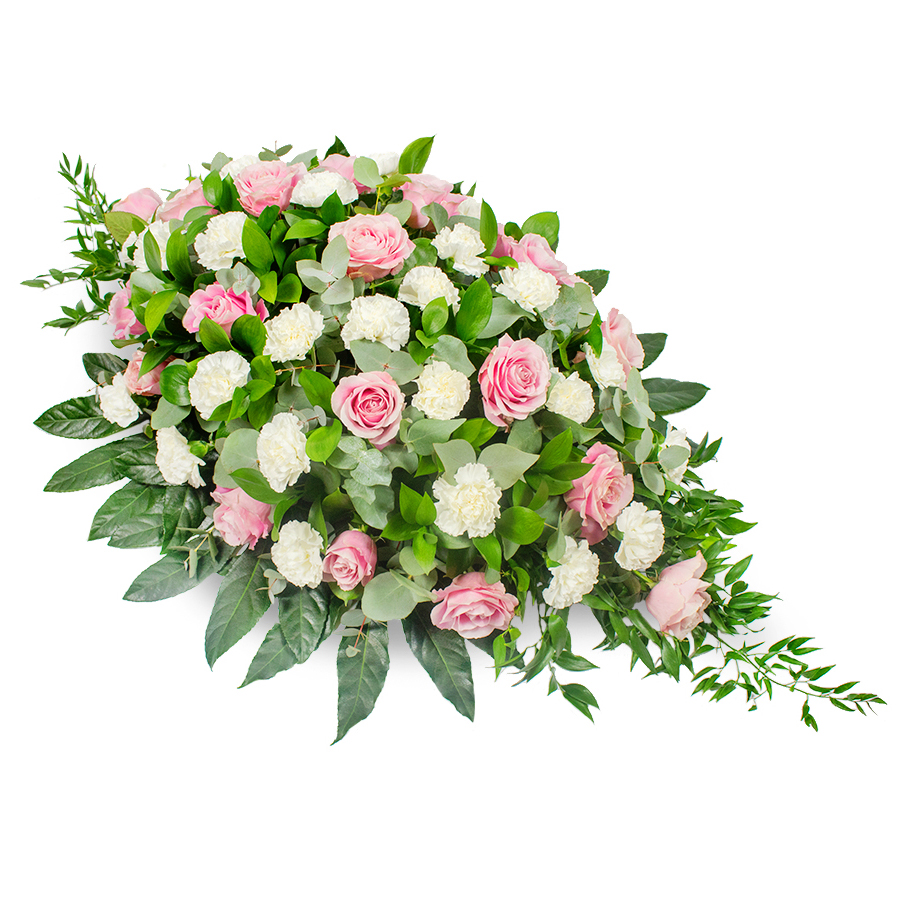 Express your deepest sympathy with our beautiful pink and white sympathy bouquet. Featuring enchanting pink roses and elegant white carnations, complemented by aral leaves, ruscus, and eucalyptus, this arrangement provides a unique and heartfelt tribute to a loved one.