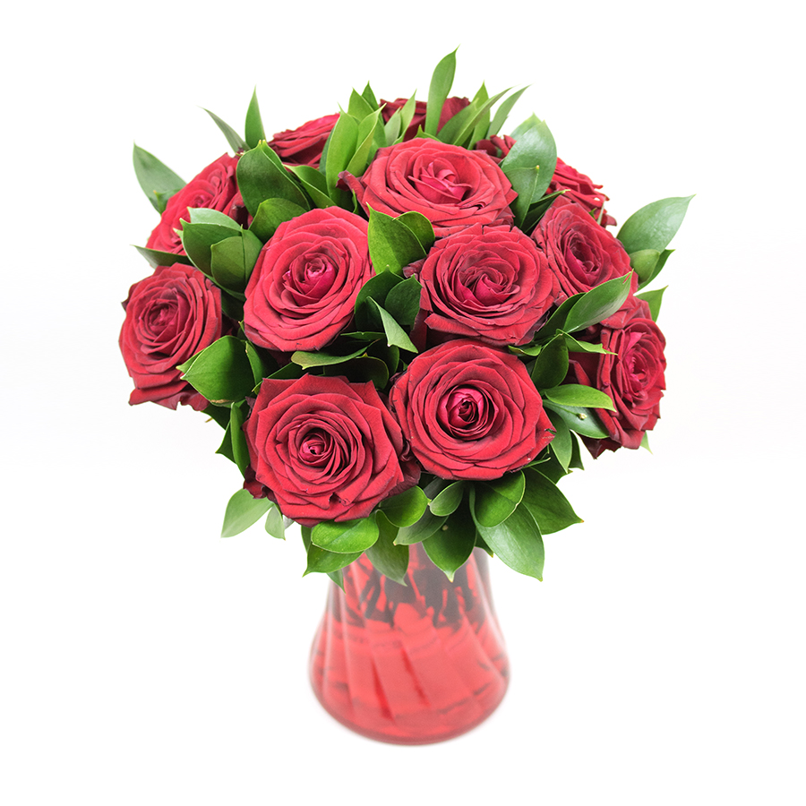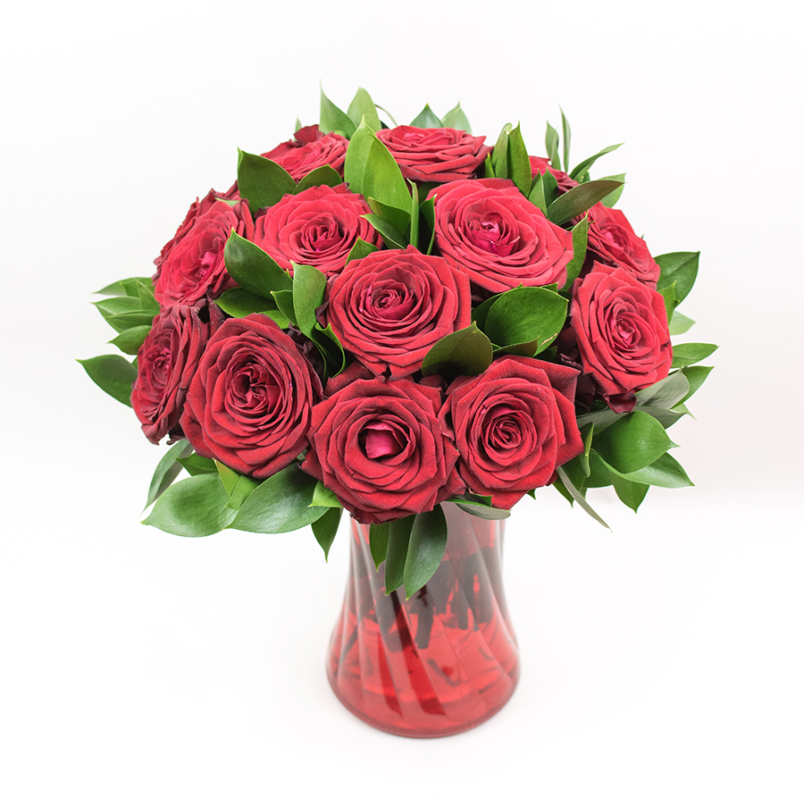 Enchant your loved ones with our elegant bouquet, featuring exquisite red roses paired with graceful aspidistra leaves. This unique arrangement embodies sophistication and beauty, making it a perfect gift for any romantic gesture.