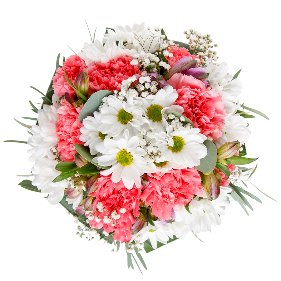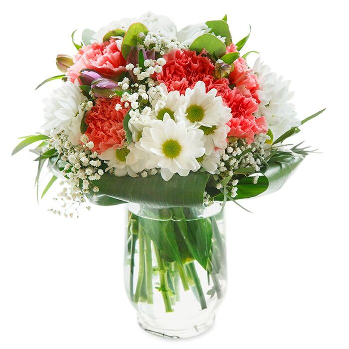 Experience the charm of our exquisite seasonal flower arrangement, crafted to bring joy and elegance to any occasion. This unique bouquet features a harmonious blend of snow-white chrysanthemums, delicate gypsophila, soft light pink carnations, and lush aspidistra leaves.